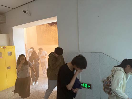 随着模拟“火情”发生,烟雾弥漫整个教室及楼道。面对突如其来的“火灾”,参与演练的师生们迅速反应,在工作人员的指引下,捂住口鼻,弯腰沿着指定的安全通道有序撤离,行动迅速、配合默契,充分展现了南宫体育